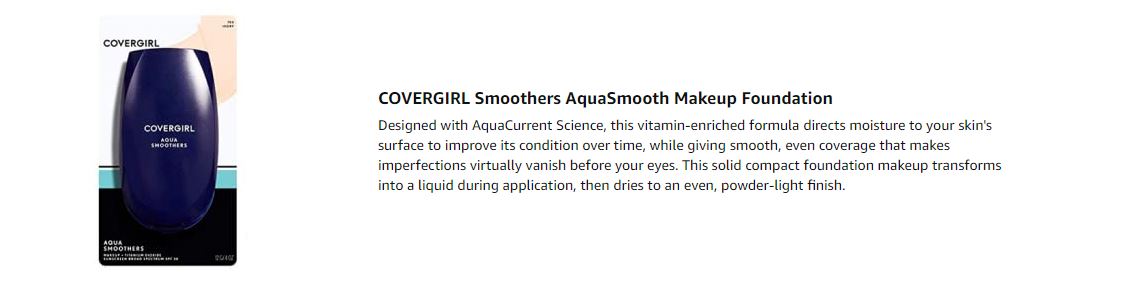 - Get incredible softness from a lightweight foundation. Smoothers AquaSmooth Makeup features broad spectrum sunscreen (SPF 20). Available in 12 different shades, ranging from light to tan. Finish off your look by pairing with COVERGIRL Smoothers Concealer