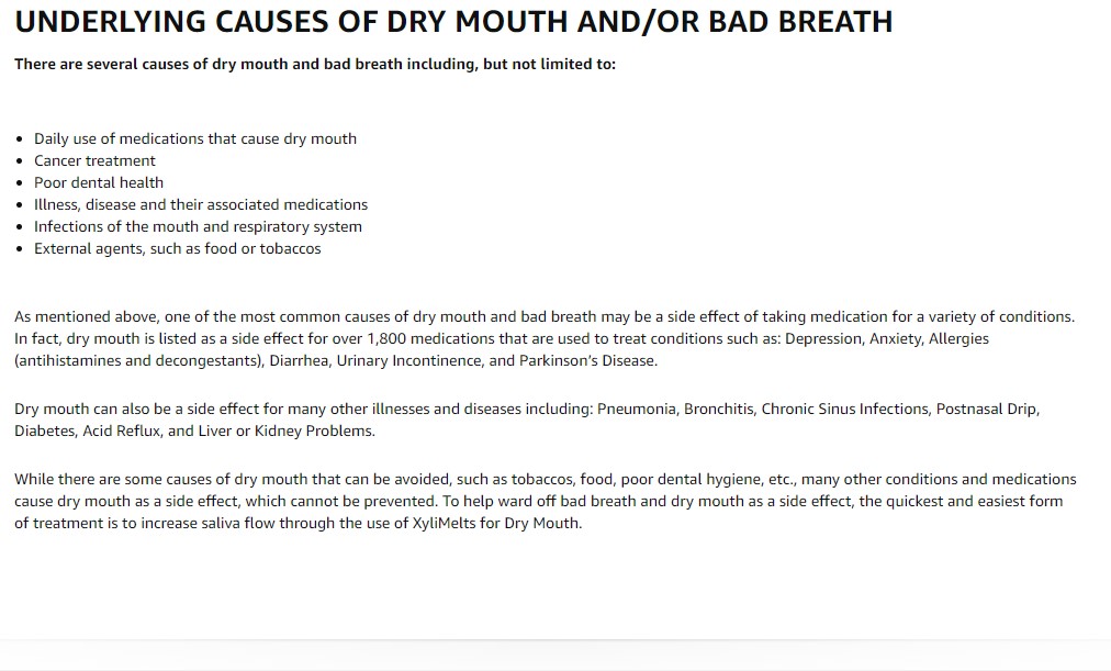 I am so pleased that I have finally found a treatment for my nighttime dry mouth. One Xylimelt adhered in my mouth will usually allow me to sleep all night without being awakened by a very dry mouth. I had tried Biotene toothpaste and mouthwash before bedtime and still woke up 2-3 times during the night. I was using the Biotene mouth spray 1-2 times during the night, also. I am grateful that my dentist gave me a sample of Xylimelts to try as it has improved my sleep tremendously. I wish drug stores carried it. I had to order my supply on line.